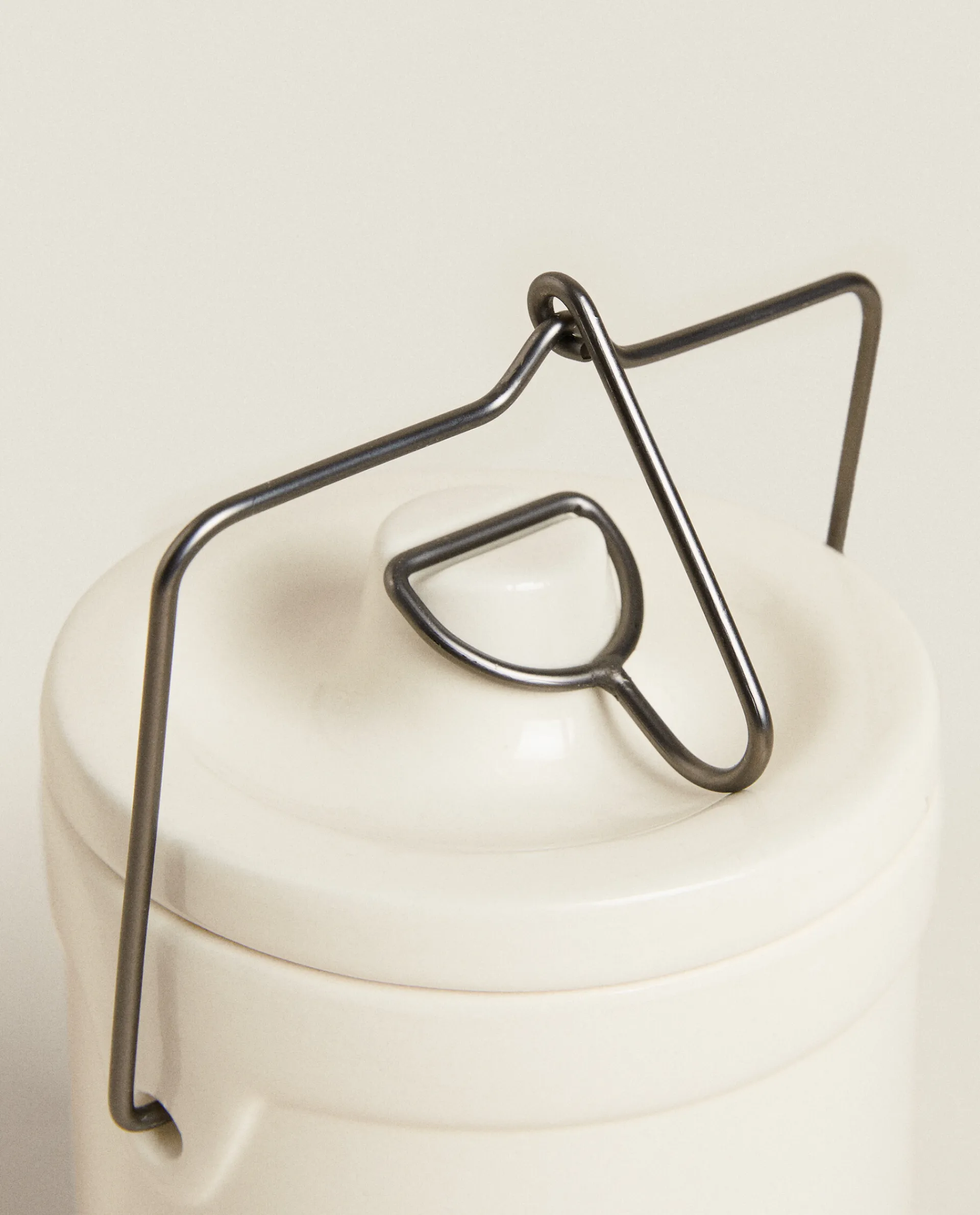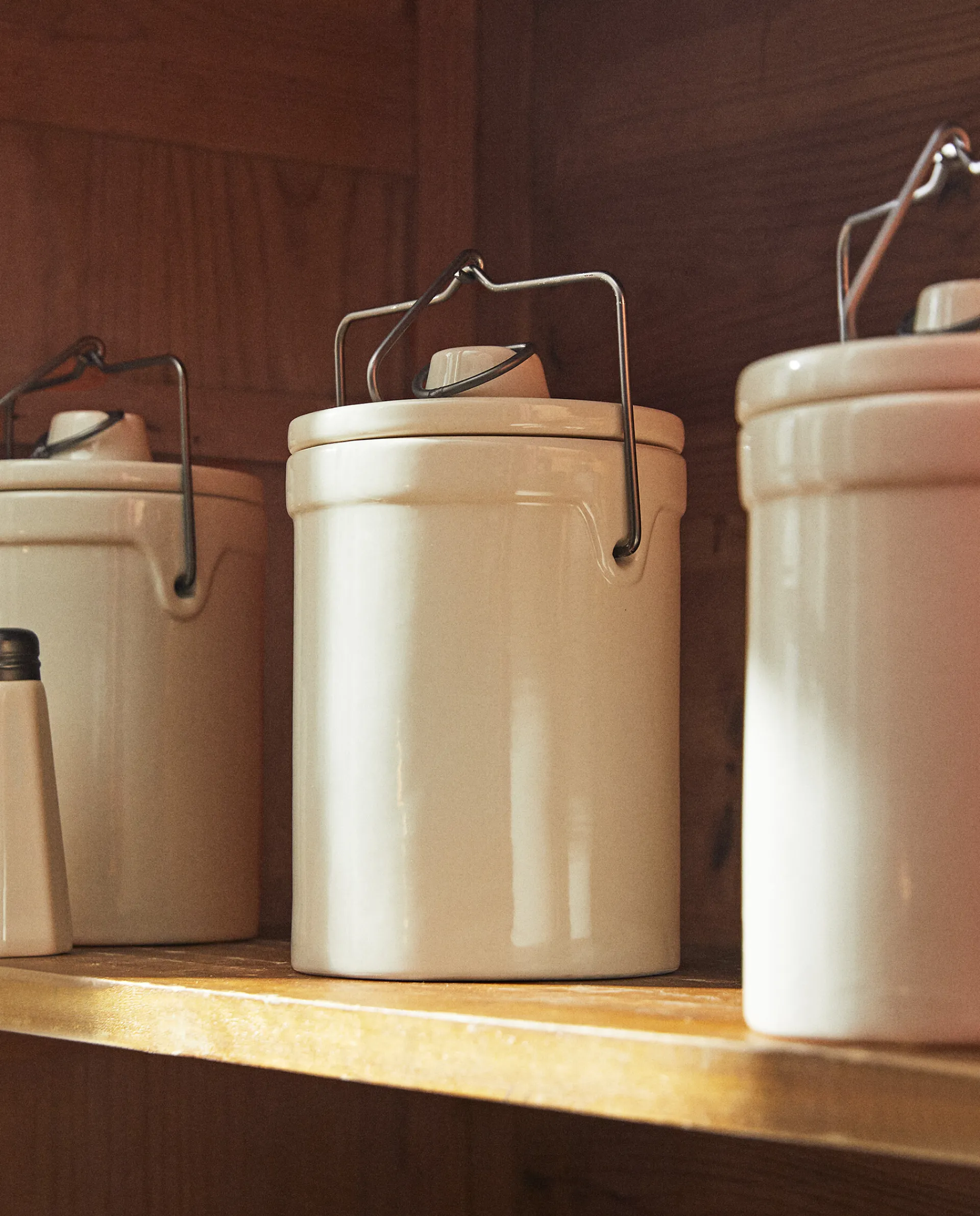Cylindrical Stoneware Jar With Steel Handles And A Pressure-Closing Lid, Designed To Enhance Food Preservation.